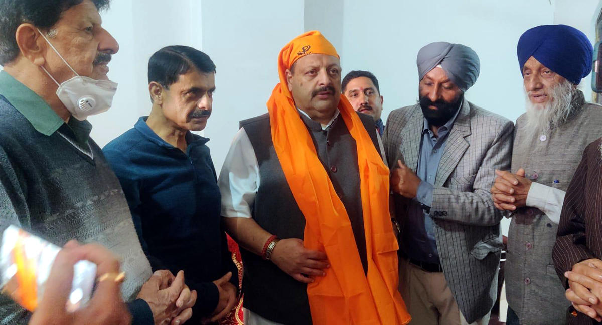Management Committee of Gurdwara presenting ‘Saropa’ to BJP leader Devender Rana in Jammu on Sunday.