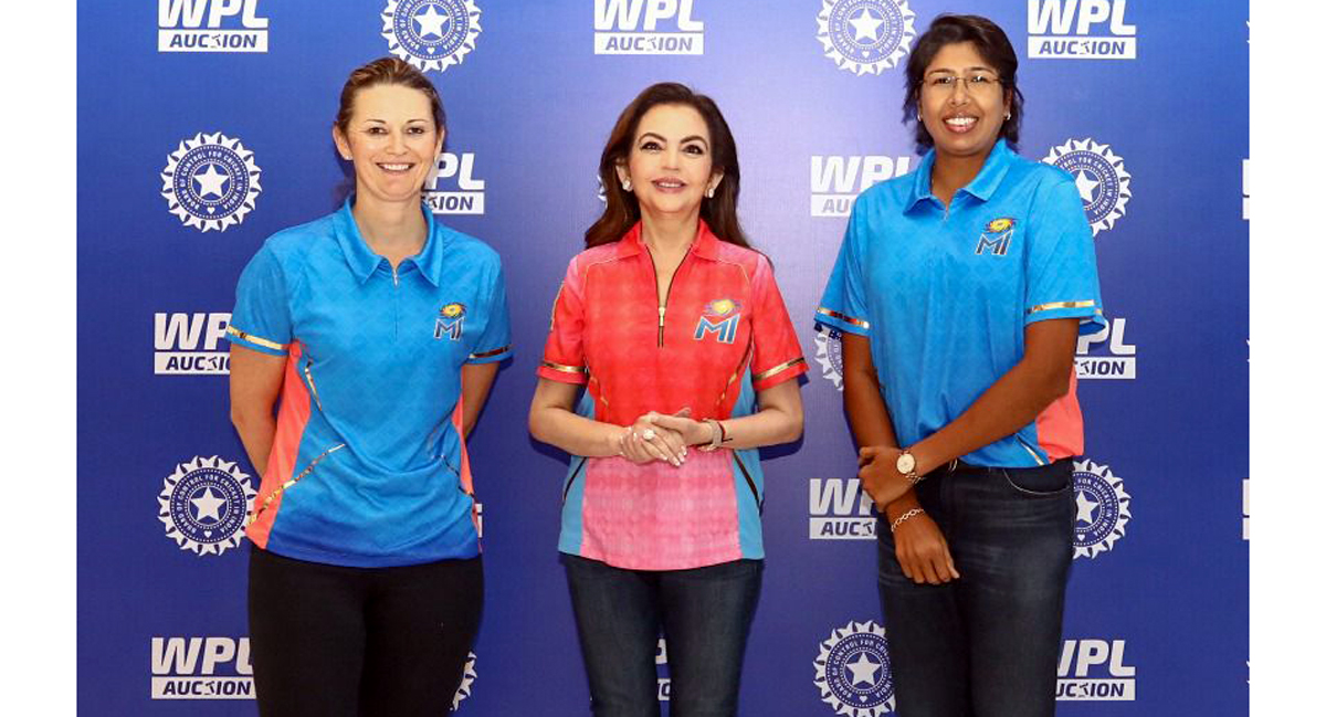 Nita M. Ambani with Charlotte Edwards, Head Coach and Jhulan Goswami, Team Mentor and Bowling Coach of the women’s team of Mumbai Indians at the Women’s Premier League auctions at Mumbai on Monday.