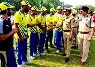 IGP HK Lohia along with DIG Jammu, Shakeel Beig interacting with the players of BCC Bulls after their emphatic win over JKP Tigers on Wednesday.