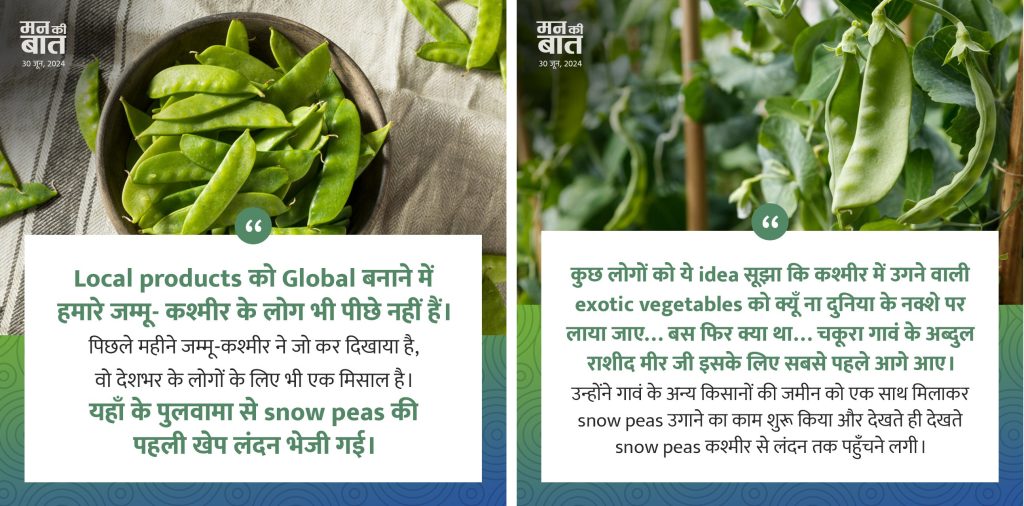 Speaking at his monthly ‘Mann Ki Baat’ radio programme, Modi said Jammu and Kashmir achieved a big milestone when the first consignment of snow peas was sent to London from south Kashmir’s Pulwama district last month.