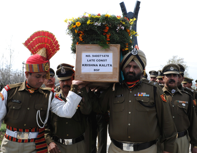 March-22, 2013- HUMHAMA: P S Sandhu Inspector General BSF along with officer carry the coffin of a BSF jawan during a wreath laying ceremony at Humhama base camp outskirts of Srinagar on Friday.Jawan was killed yesterday in militants attack Matthan Gulshan Nagar on Srinagar- Jammu National High way. At least One BSF jawan were killed and two others seriously injured when militants open fire on 8th Bn BSF Vehicle. Photo/Mohd Amin War