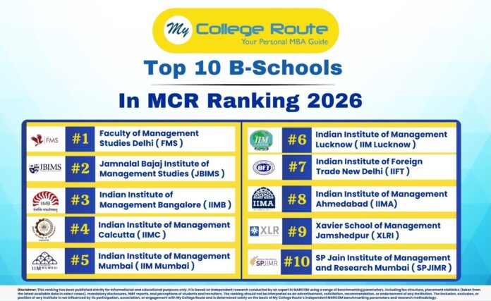 Disclaimer: The MARCOM – My College Route Best B-School Survey 2026 is an independent research-based ranking exercise conducted purely for informational and reference purposes for MBA/PGDM aspirants, parents, and other stakeholders. This survey and the resulting rankings should not be construed as an advertisement, endorsement, recommendation, solicitation, or promotion of any particular institution.