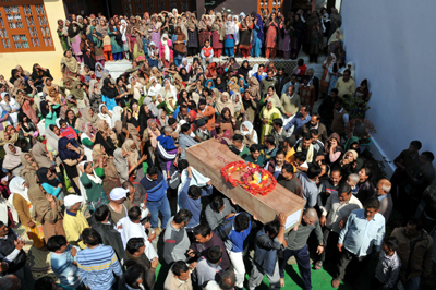 Heart rendering scenes were witnessed with relatives and friends of the martyr wailing and sobbing as the body of this brave cop wrapped in tricolour reached the village at 2 pm today. All the eyes were wet and nobody could control his emotions and sentiments. The situation in the village became tense when people from this land of Dogra warriors saw the body of one of its promising and brave youth has met the end in the prime of his life.