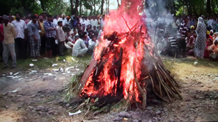 Martyr Gurnam Singh’s body being consigned to flames at his native village Bhalesar in R S Pura on Monday. -Excelsior/ Rakesh
