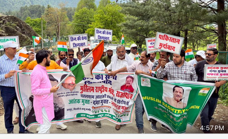 JAMMU, May 13: The Muslim Rashtriya Manch (MRM) which has embarked on the “Bharat Yatra,” a nationwide initiative supporting the Indian Army and advocating for a terror-free, riot-free and hate-free nation today reached Pahalgam in South Kashmir district of Anantnag where 26 tourists were gunned down by Pakistani terrorists on April 22 and staged a massive demonstration there.