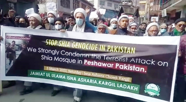 KARGIL, Mar 5: Hundreds of people under the banner of Jamiat Ulema Isna Ashriya Kargil took out a massive protest rally against the cold-blooded killing of Shia Muslims during Friday prayers in a mosque at Peshawar, Pakistan.