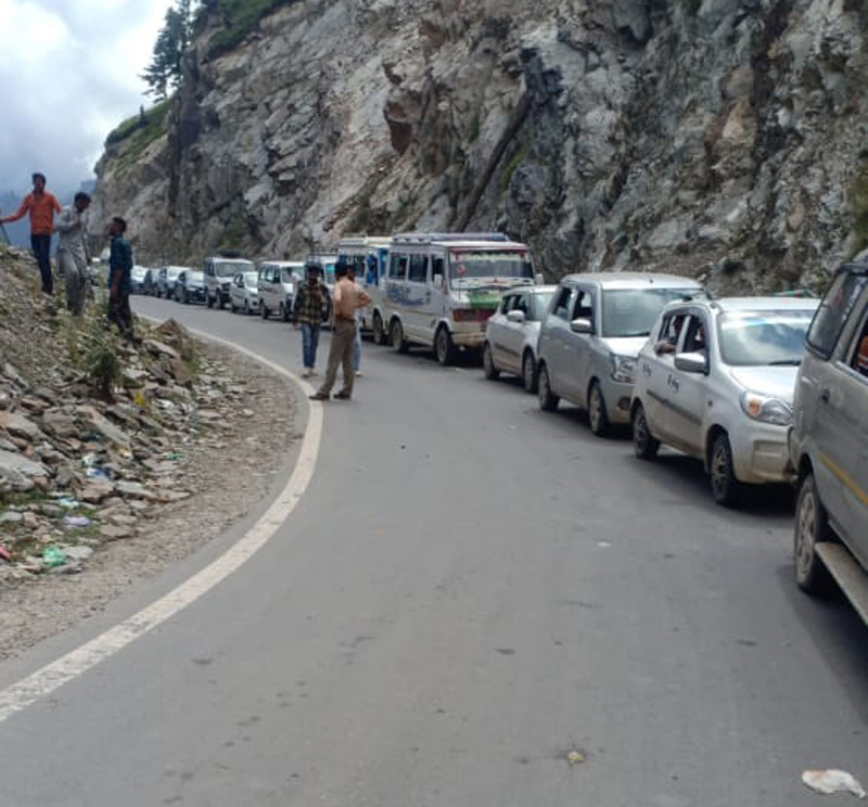 Several people caught in long traffic jam in Behramgalla and Poshana area today said that on the name of checking/ frisking by Army and Police, long traffic jams are being created on Mughal Road. Today many vehicles remained trapped for hours together in the traffic jams. The passengers travelling along with their children had to suffer for long.