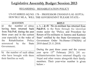 In reply to un-starred Question of BJP breakaway group leader Prof Chaman Lal Gupta, the Minister Incharge Home said: “during the past three years and the current year up to February 2013, 241 ex-militants/terrorists have returned illegally via Nepal and other routes along with their family members.”