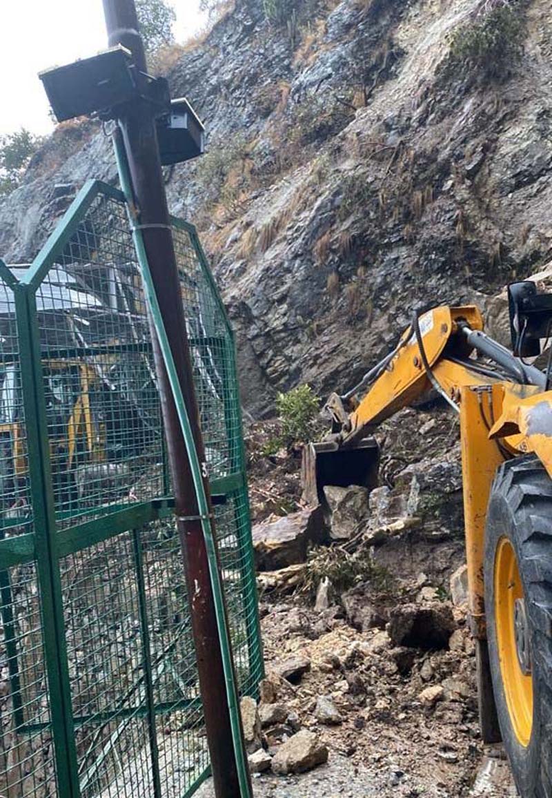 Mata Vaishnodevi track damaged in landslide being cleared by JCB on Sunday. -Excelsior/Ramesh Mengi