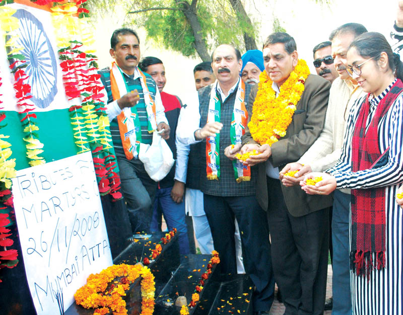 Mayor Jammu, Chander Mohan Gupta, and others paying tributes to 26/11 martyrs at Dogra Shourya Sthal, Amphalla in Jammu. By Daily Excelsior - November 27, 2018 Share FacebookTwitterWhatsAppPinterestLinkedinCopy URLTelegramEmailTumblrReddItPrintKoo Mayor Jammu, Chander Mohan Gupta, and others paying tributes to 26/11 martyrs at Dogra Shourya Sthal, Amphalla in Jammu. Mayor Jammu, Chander Mohan Gupta, and others paying tributes to 26/11 martyrs at Dogra Shourya Sthal, Amphalla in Jammu. Follow our WhatsApp channel