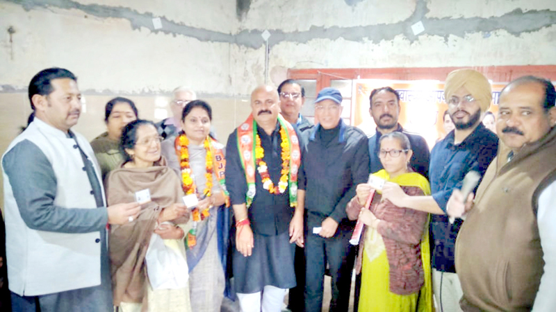 JAMMU, Mar 6: State BJP general secretary, Yudhvir Sethi along with Corporator Ward 10, Jammu East, Anil Masoom distributed golden cards among Ayushman Bharat beneficiaries here, today.