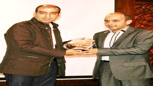 MD Khyber Himalayan Resort & Spa, Omar Trambu presenting award to Managing Partner of Mascot, Yasin Tuman at Gulmarg on Friday.