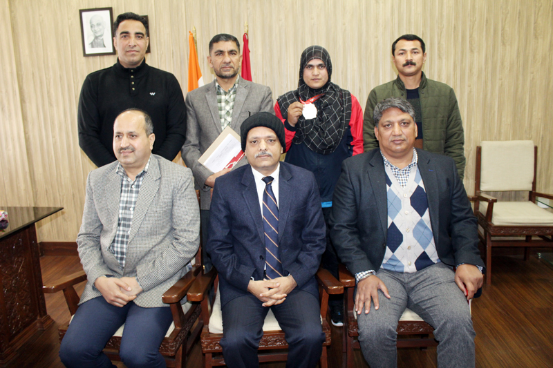 Medal winner Wushu player Khalida Bano posing for a group photograph with ADGP Armed J&K and Senior Officers of APHQ during felicitation ceremony.