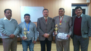 Medal winners Bansi Lal and Deepak Jyoti posing alongwith RK Kaul, CGMT J&K Circle, Jeet Raj Kalsi, Secretary, J&K BSNL Sports and Cultural Board and GL Dogra, Manager of the team.