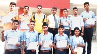 Medal winning students of GD Goenka Public School displaying certificates while posing for a group photograph in School premises.