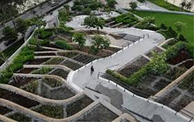 Water that’s not absorbed by the plants runs down to a pond at the base of the park, where it can be stored and filtered for use during dry spells or released gradually. In cases of severe flooding, the park can hold up to a million gallons of water.