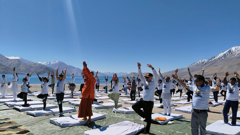 LEH, June 20: In the lead-up to International Yoga Day, a mega Yoga Camp was held on the picturesque banks of Pangong Lake, drawing nearly 1,000 participants. Among them were Army and paramilitary personnel, students and local residents.
