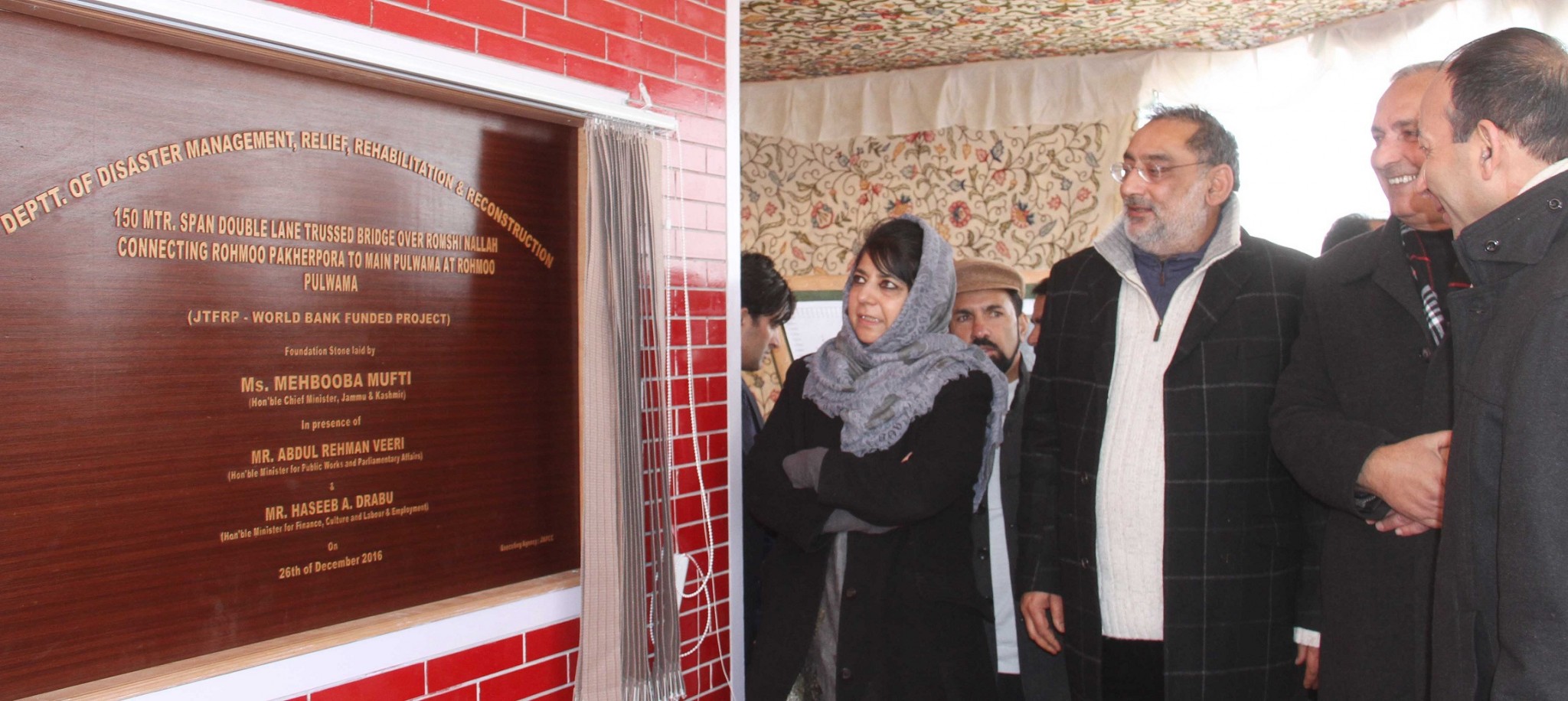 PULWAMA: Chief Minister, Mehbooba Mufti today laid foundation stones of Rs 40 crore bridges over Rambiarah and Romshoo nallahs connecting several villages of Pulwama, Shopian and Budgam districts. These bridges would be constructed by the Department of Relief, Rehabilitation, Reconstruction & Disaster Management and would be completed within two years under World Bank-funded Jhelum-Tawi Flood Recovery Project.