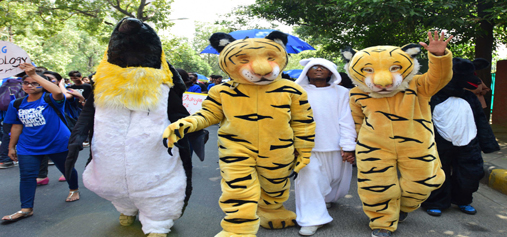 Members of an NGO dressed as Tigers and Penguin participating at the People's Climate March for creating awareness among citizens about the climate change in New Delhi on Saturday. (UNI)