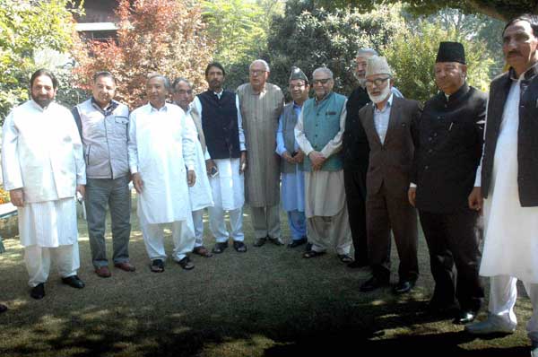 Members of all Opposition parties including National Conference, Congress and CPI (M) at a meeting in Srinagar on Friday. (UNI)