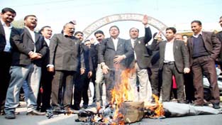 Members of Bar Association Kathua torching effigy of Deputy CM on Friday.