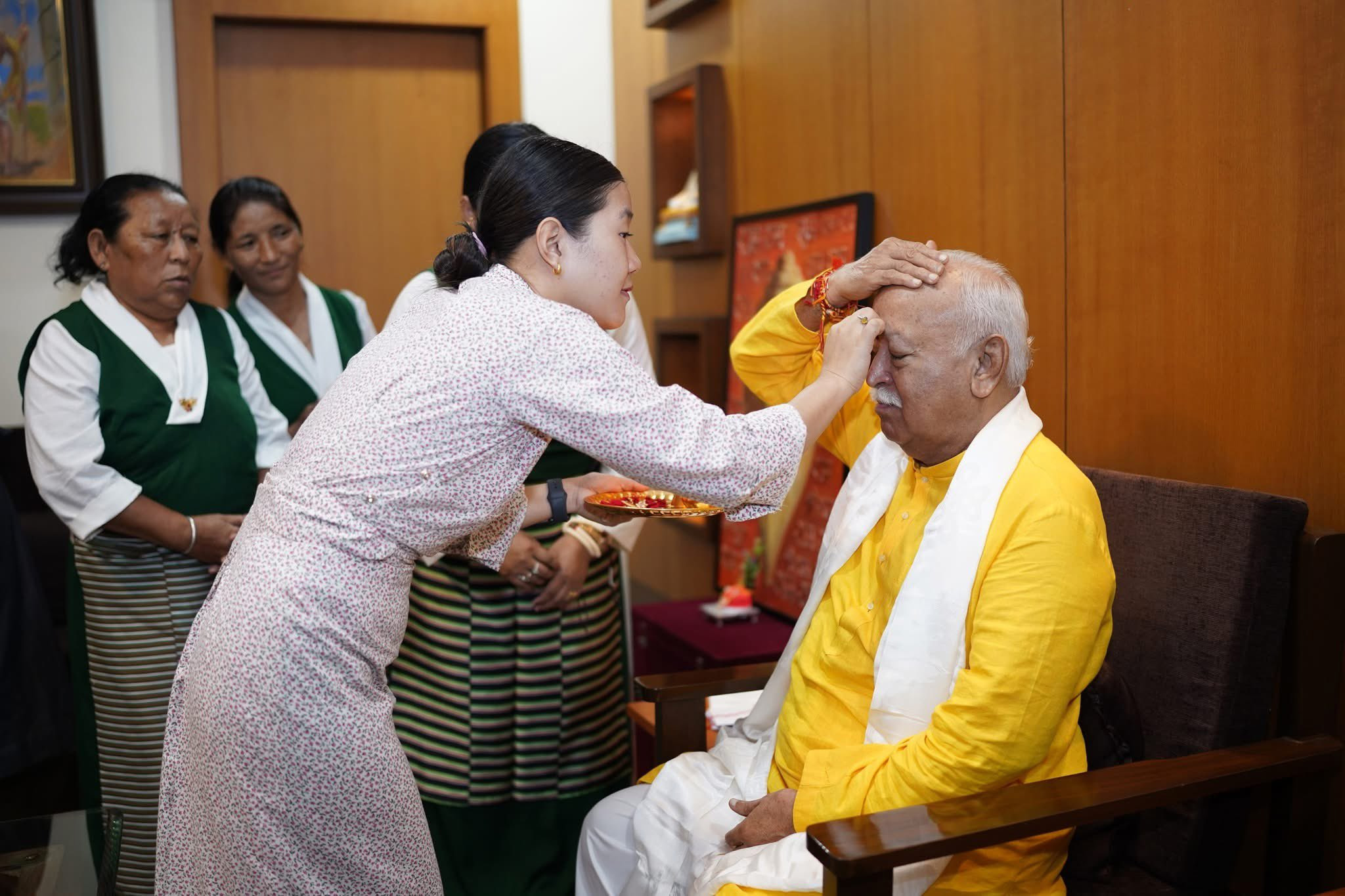 Members of the Regional Tibetan Women’s Association and Bharat Tibet Cooperation Forum tied a rakhi to Bhagwat, stated a release issued by the Vishva Samvad Kendra.