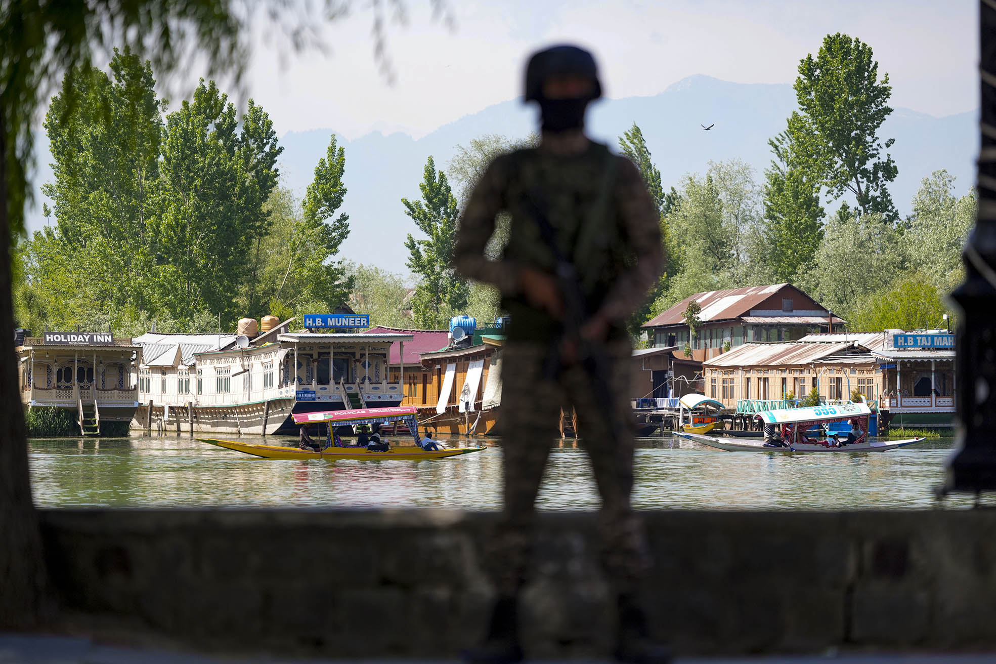 A security official keeps vigil along the Dal Lake area amid heightened security ahead of the Pahalgam attack anniversary, in Srinagar.