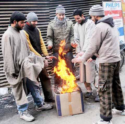 January-07, 2011-SRINAGAR: Kashmiri shopkeepers warm themselves near a fire on a cold day at Budshah chowk in Srinagar on Friday. Photo/Mohd Amin War