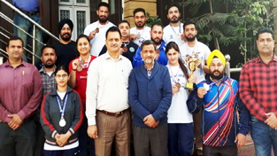 Meritorious Power Lifters of J&K posing for a group photograph along with dignitaries after excelling in National Championship.