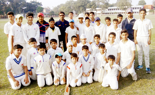 Teams posing for a group photograph alongwith coaches during exhibition cricket match at GGM Science College Hostel ground in Jammu on Sunday.