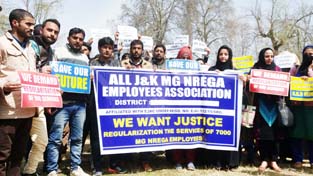 MGNREGA employees staging protest in Baramulla. Excelsior/ Abid Nabi