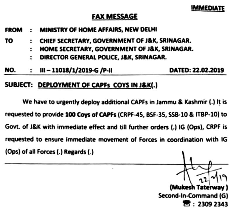 An official communication of the MHA addressed to the Chief Secretary, Home Secretary and Director General of Police, J&K said: “We have to urgently deploy additional 100 companies of Central Armed Police Forces (CAPFs) to Kashmir with immediate effect. The IG Operations CRPF are requested to ensure immediate movement of forces in coordination with IG Operations of all Forces”.