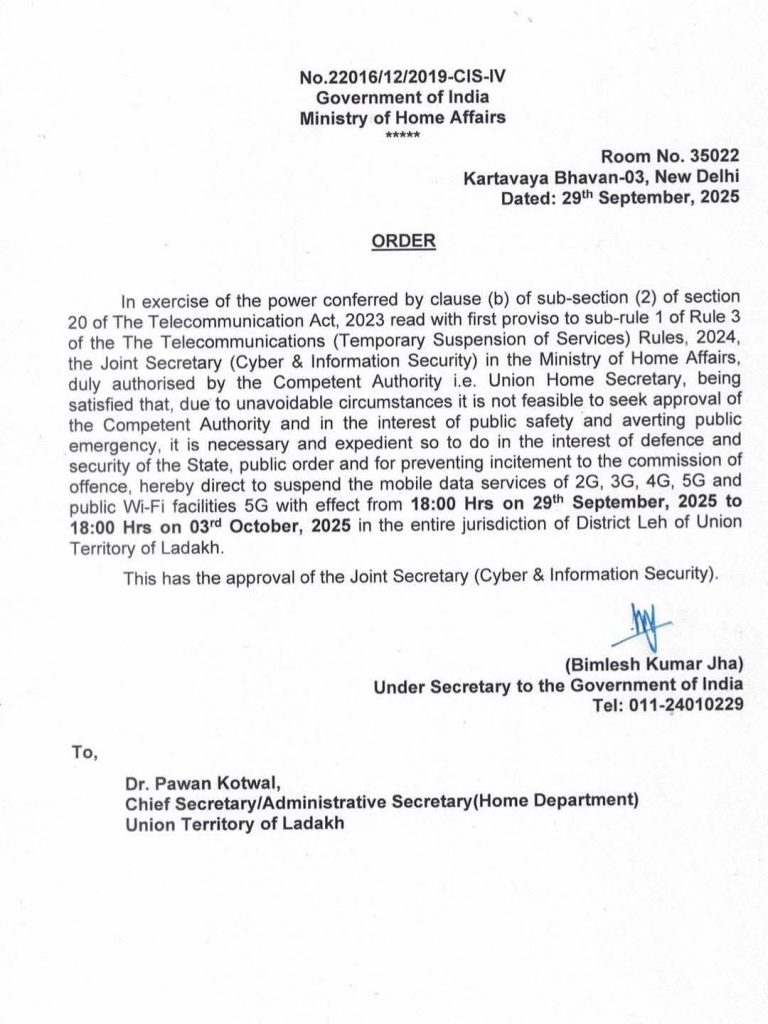New Delhi/Leh, Sep 30: The Ministry of Home Affairs on Tuesday ordered a complete suspension of mobile internet and public Wi-Fi services in Ladakh’s Leh district from September 29 evening till October 3, citing public safety and security concerns.