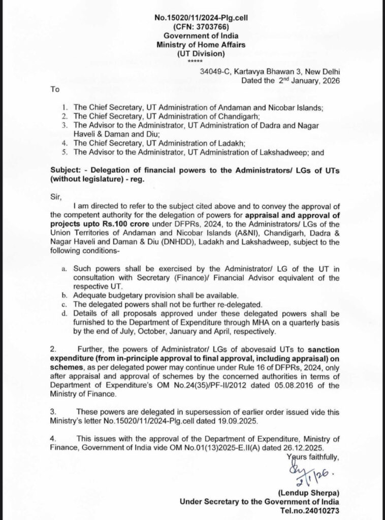 “I am directed to refer to convey the approval of the competent authority for the delegation of powers for appraisal and approval of projects upto Rs100 crore under DFPRs, 2024, to the administrators and LGs of the union rerritories of Ladakh, Andaman and Nicobar Islands, Chandigarh, Dadra & Nagar Haveli and Daman & Diu and Lakshadweep, (subject to the certain condition)” Under Secretary to the Government of India, MHA, Lendup Sherpa said in an order.