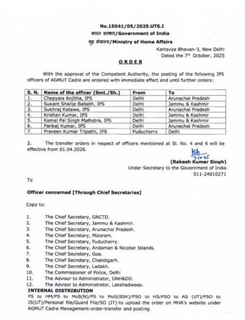 Jammu, Oct 7: The Ministry of Home Affairs has ordered the transfer of three Indian Police Service (IPS) officers from the Delhi segment to the Jammu and Kashmir segment of the AGMUT cadre.