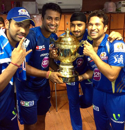 MI captain Rohit Sharma, Sachin Tendulkar, Harbhajan Singh and Pragyan Ojha pose with IPL trophy at Eden Gardens, Kolkata.