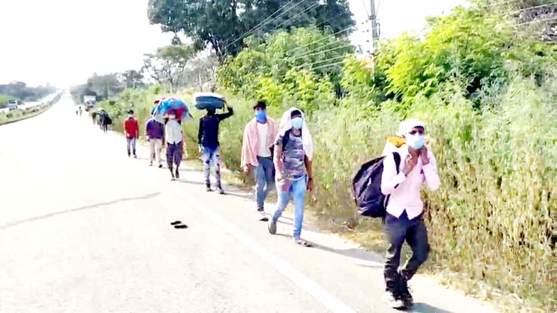 Migrant labourers marching on foot towards Lakhanpur to leave for their home States. -Excelsior/Pardeep