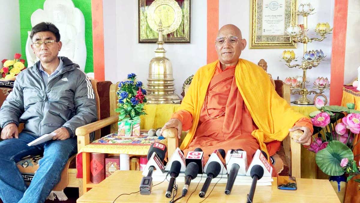 Founder of MIMC Bhikkhu Sanghsena addressing a press conferencing at Leh. -Excelsior/Stanzin Dorjay