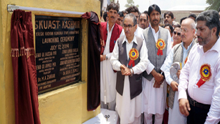 Minister for Agriculture Ghulam Hassan Mir and Minister for Tourism Ghulam Ahmad Mir laying foundation stone of KVK at Nowpora on Saturday.