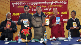 Minister for Cooperative Chhering Dorjey and others releasing books during inaugural function of Ladakh Multilingual Literary Conference at Leh.