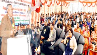 Minister for Cooperatives, Chering Dorjey addressing a gathering at Jammu on Sunday.