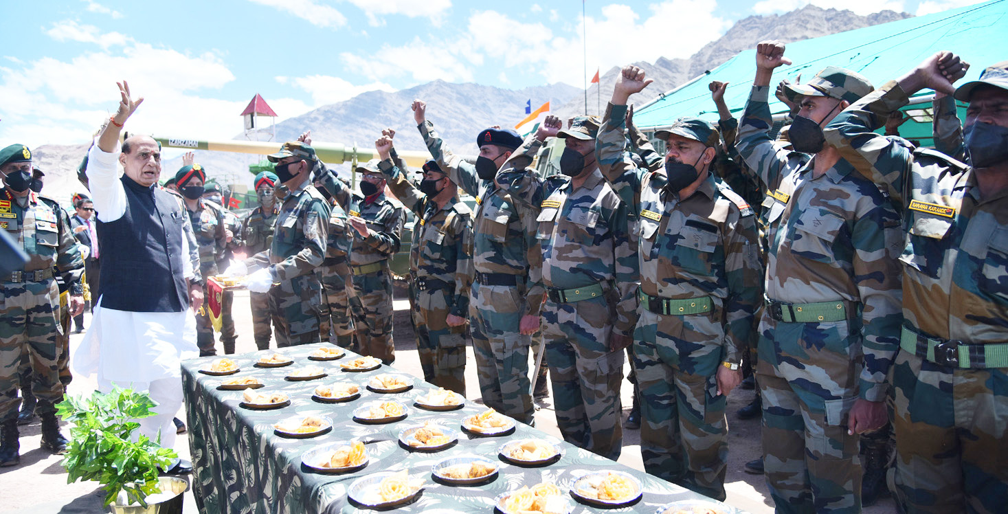 Minister for Defence Rajnath Singh interacting with the troops of Indian Army’s 14 Corps in Ladakh on Monday. -Excelsior/Morup Stanzin