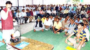 Minister for Forest, Ch Lal Singh addressing a public gathering at Basohli on Friday.