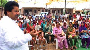 Minister for Horticulture Raman Bhalla addressing public gathering at Joogian Mohalla on Sunday.