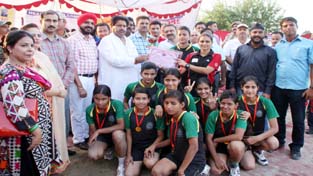 Minister for Housing, Horticulture and Culture Raman Bhalla felicitating winners of junior kabaddi tournament in Jammu on Monday.
