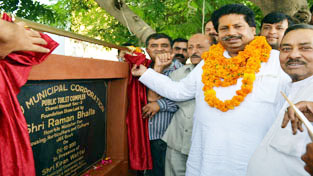 Minister for Housing Raman Bhalla laying foundation stone of development work at Channi Himmat on Sunday.