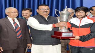 Minister for Industries and Commerce, Chander Prakash Ganga presenting trophy to winner during concluding ceremony of 43rd State Badminton Championship.