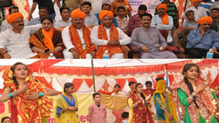 Minister for Industries & Commerce Chander Prakash Ganga and MoS for Education Priya Sethi alongwith BJP leaders witnessing a cultural bonanza during Baisakhi carnival at Rajpura in Jammu on Monday.