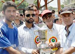 Minister for Information and Technology, Aga Syed Ruhullah Mehdi presenting winners trophy to the captain of Al-Hilal Sports Club in Srinagar on Monday.