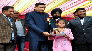 Minister for PHE, Irrigation and Flood Control, Sham Lal Sharma felicitating a student during an annual day function of a school in Akhnoor.